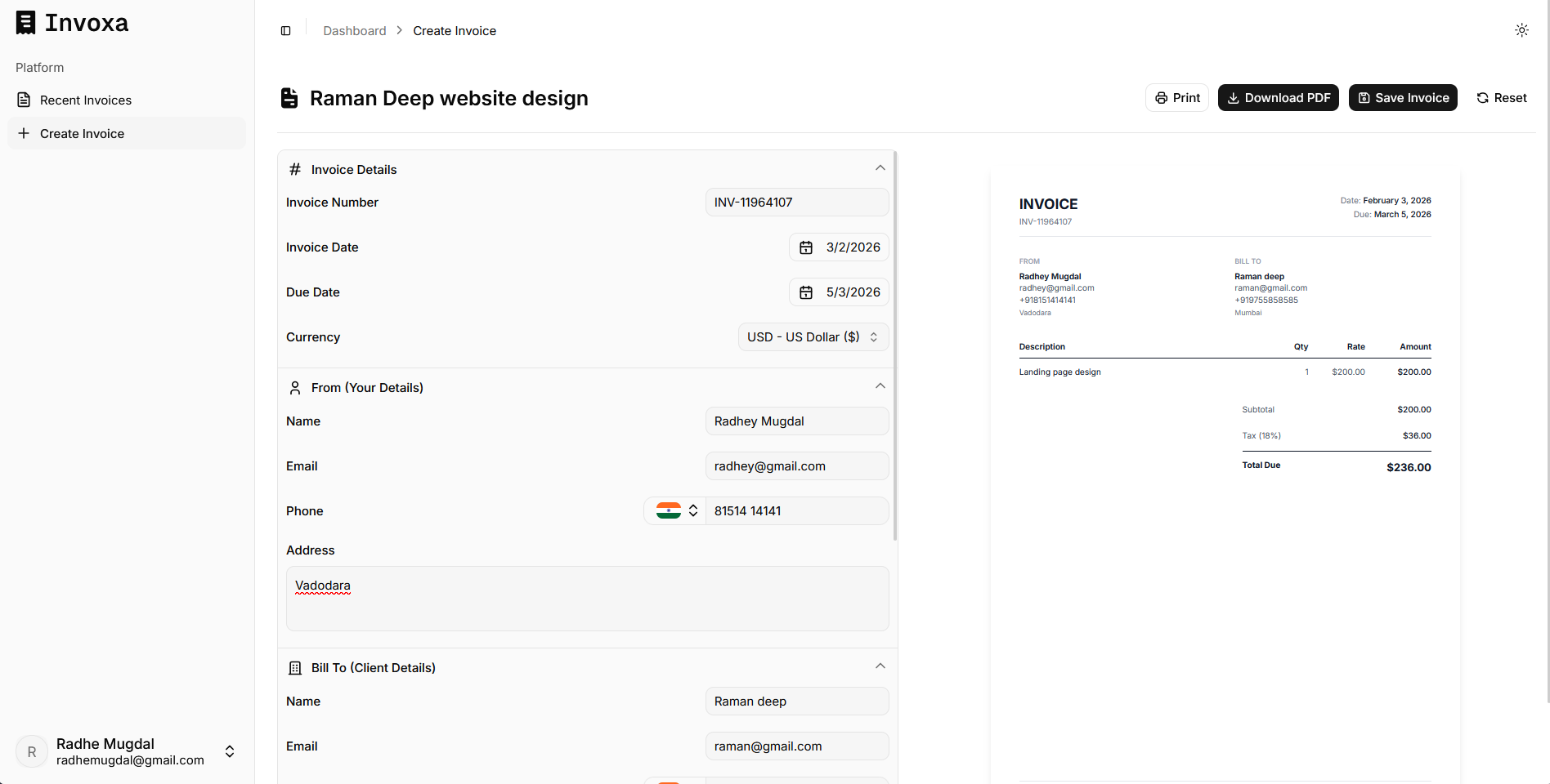 Create professional invoices in seconds with a clean, modern layout.